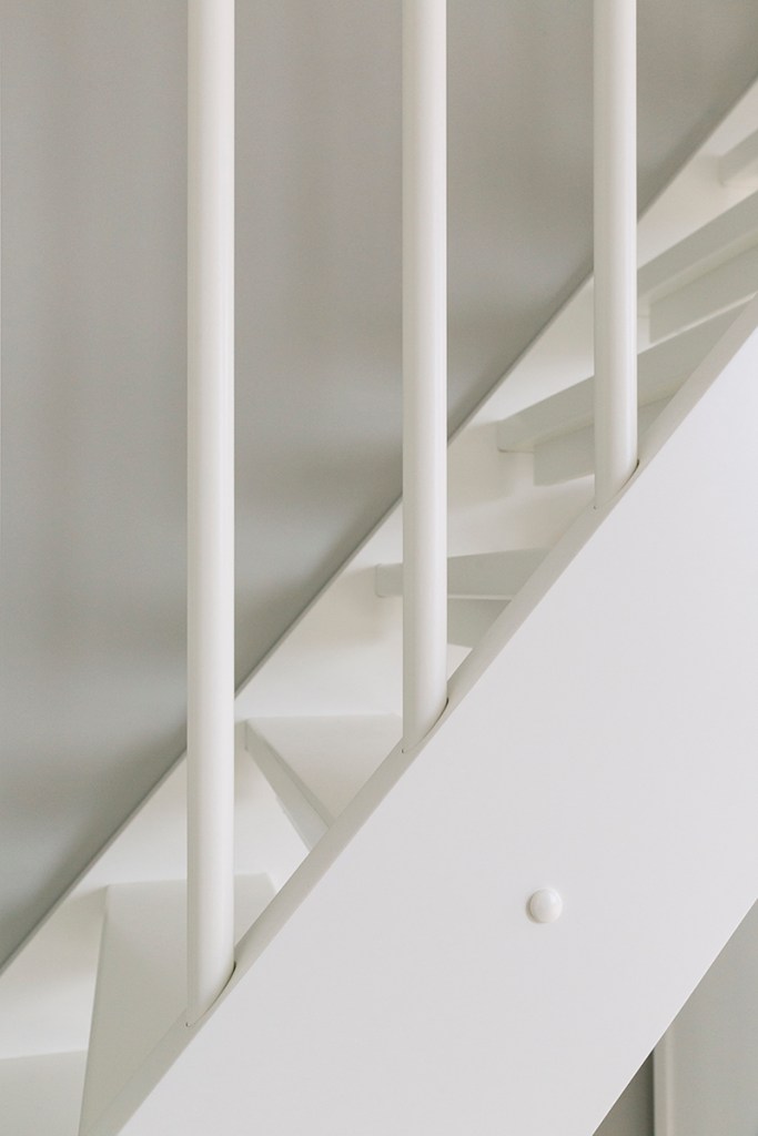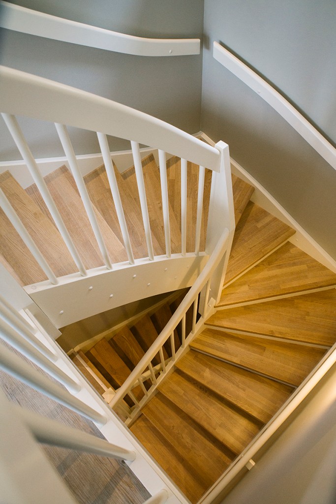 Dette er vår standard trapp, og bestselger. Hele trappen blir produsert i kvistfri furu, og malt i hvitfargen «bomull».