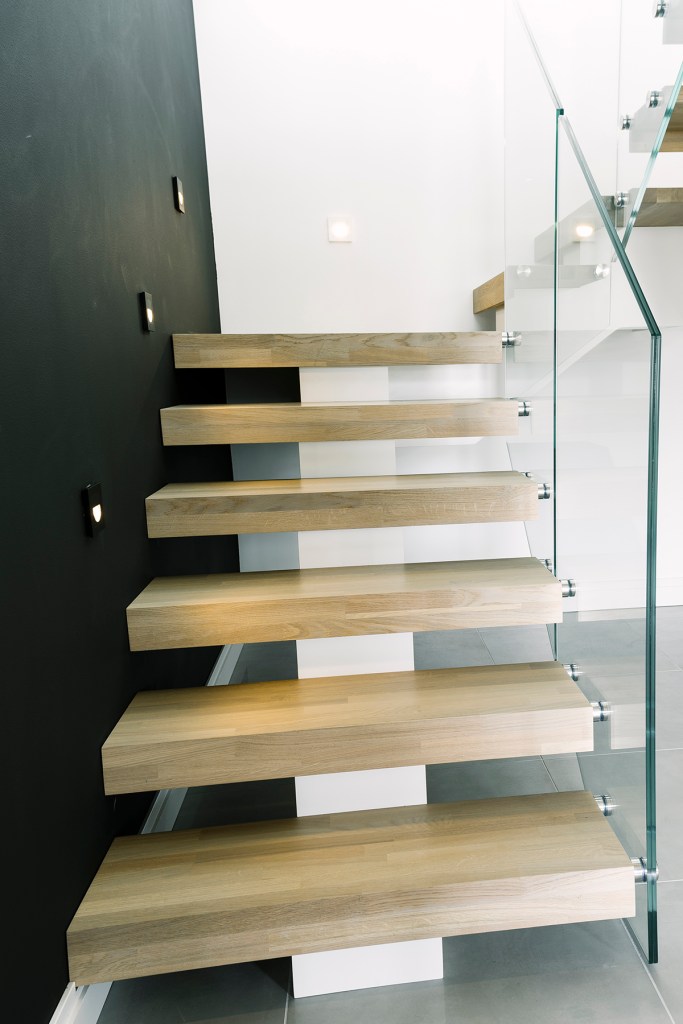 Stoltzekleiven er en av våre mest eksklusive designtrapper. Her får du midtvange og boltet glassrekkverk. En nydelig kombinasjon av naturlig treverk og moderne glass. Som standard er trappen åpen med barnelist under trinn. Vangen blir malt i «bomull», mens trinnene i eik er mattlakket.